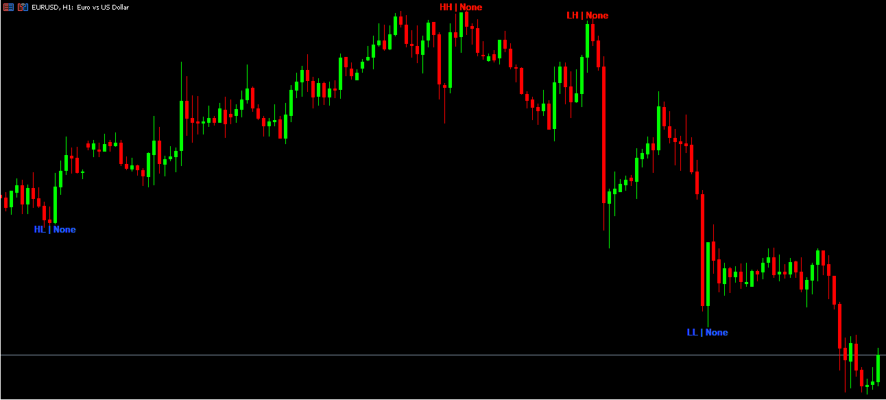 The Swing Highs-Lows & Candle Patterns Indicator MT5 scans price movements to identify new highs and lows in real-time. Each structural point is labeled directly on your chart—using clear, color-coded tags:
