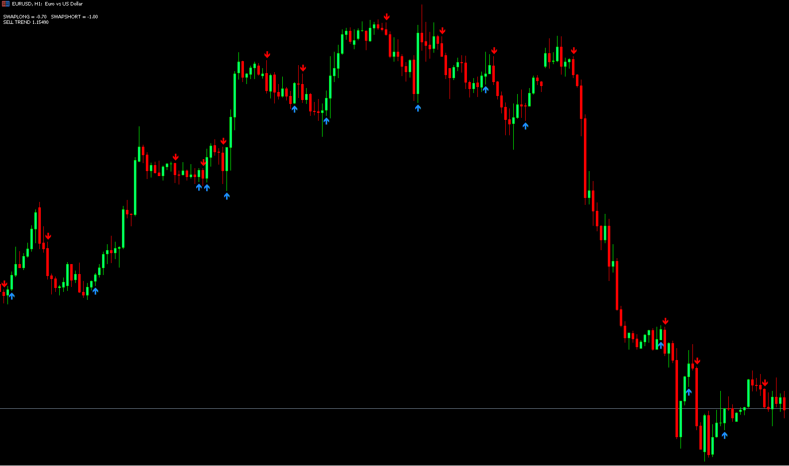 Imagine a strong uptrend on EUR/USD. When a red arrow appears, it could suggest a temporary bearish reversal—potentially a good time to close long positions or prepare for short trades.
