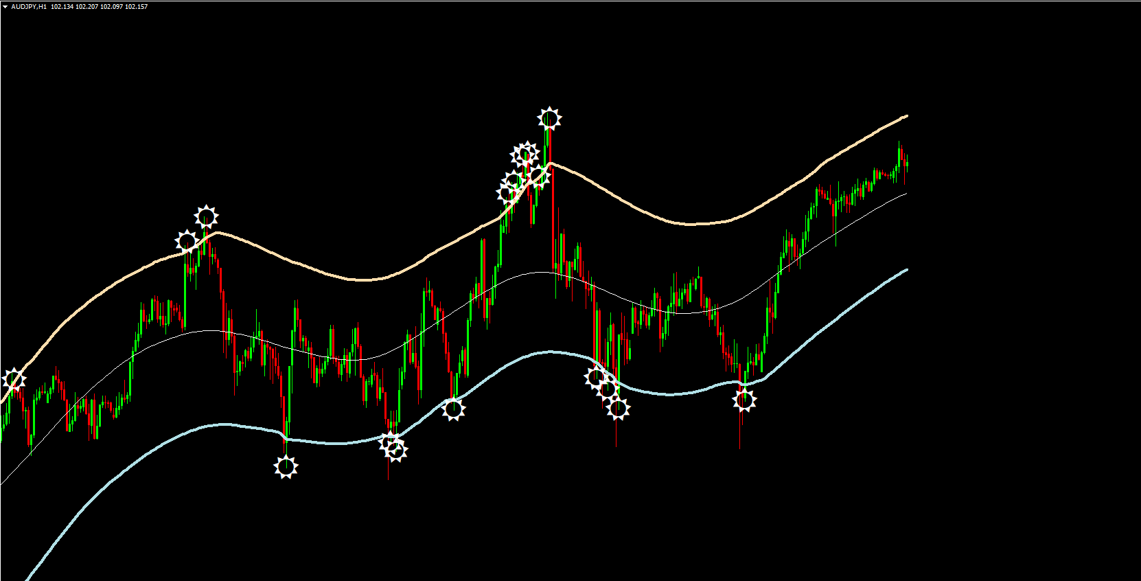 When the price interacts with either band, it signals a potential reversal. The indicator also features buy/sell signal stars: