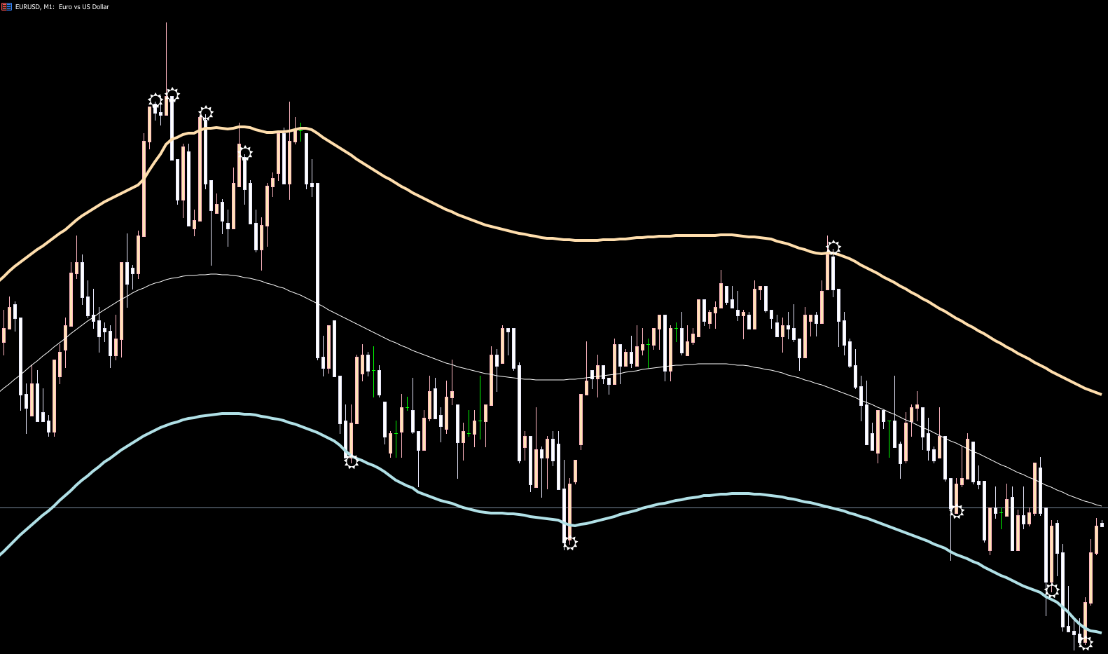 The indicator uses a default 55-bar analysis period to evaluate past price behavior. By examining historical price movement, it identifies areas where the market is likely to reverse. Additionally, the Target Bands Indicator includes buy/sell entry signals represented by stars above or below the candlesticks: