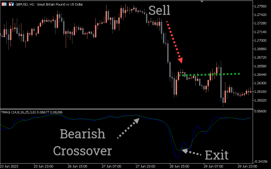 In this setup, the Tmagi indicator displayed a bearish crossover as the price broke below trendline support. Both moving averages shifted under the zero line, confirming strong bearish momentum.