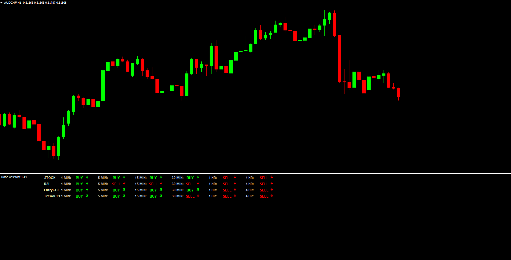 This combination of momentum indicators and multi-timeframe analysis makes the Trade Assistant Indicator an effective tool for trend confirmation and timing entries or exits.