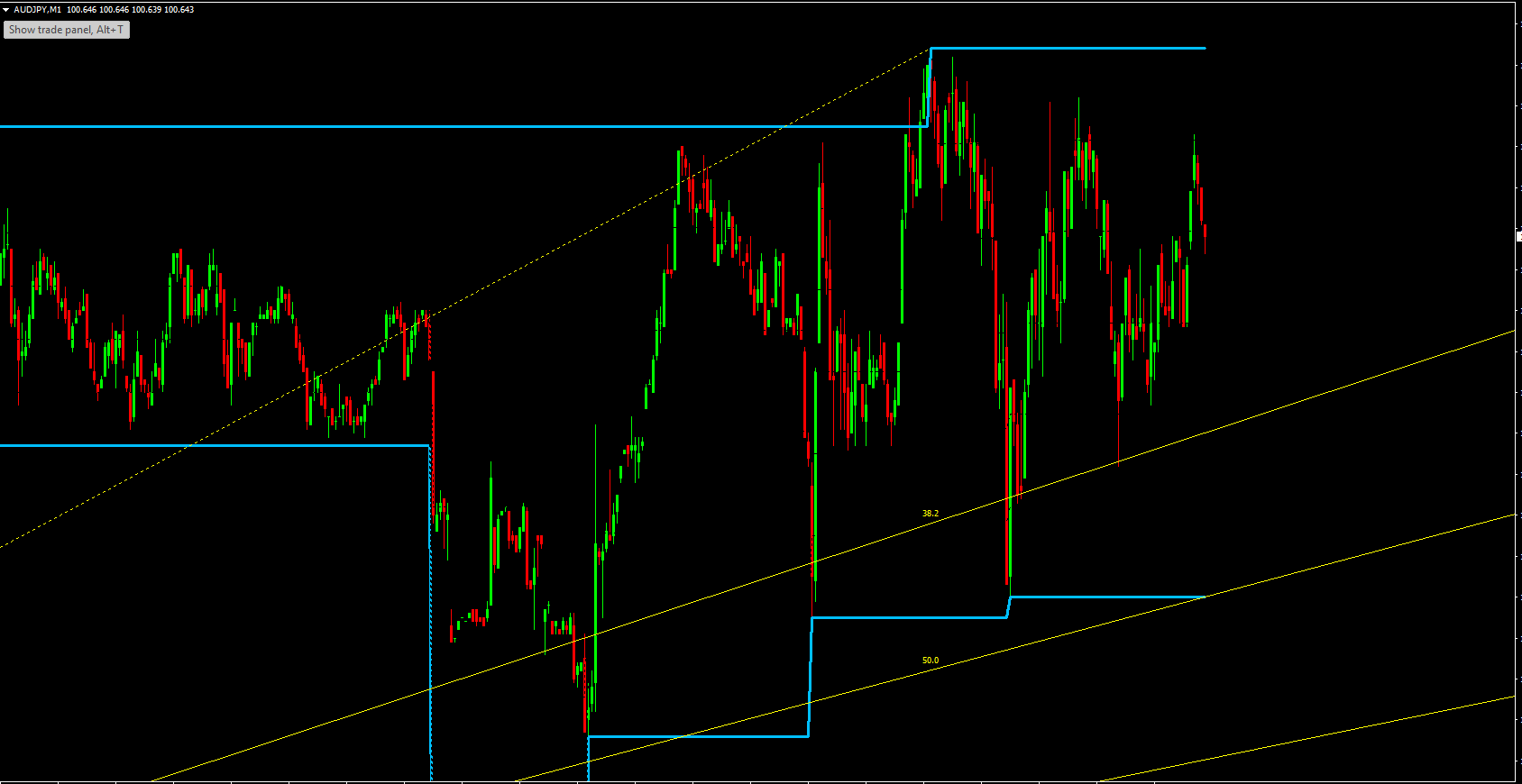 The Trade Channel Indicator for MT4 automatically plots a trading channel on the chart by detecting key fractal levels and Fibonacci retracement zones.