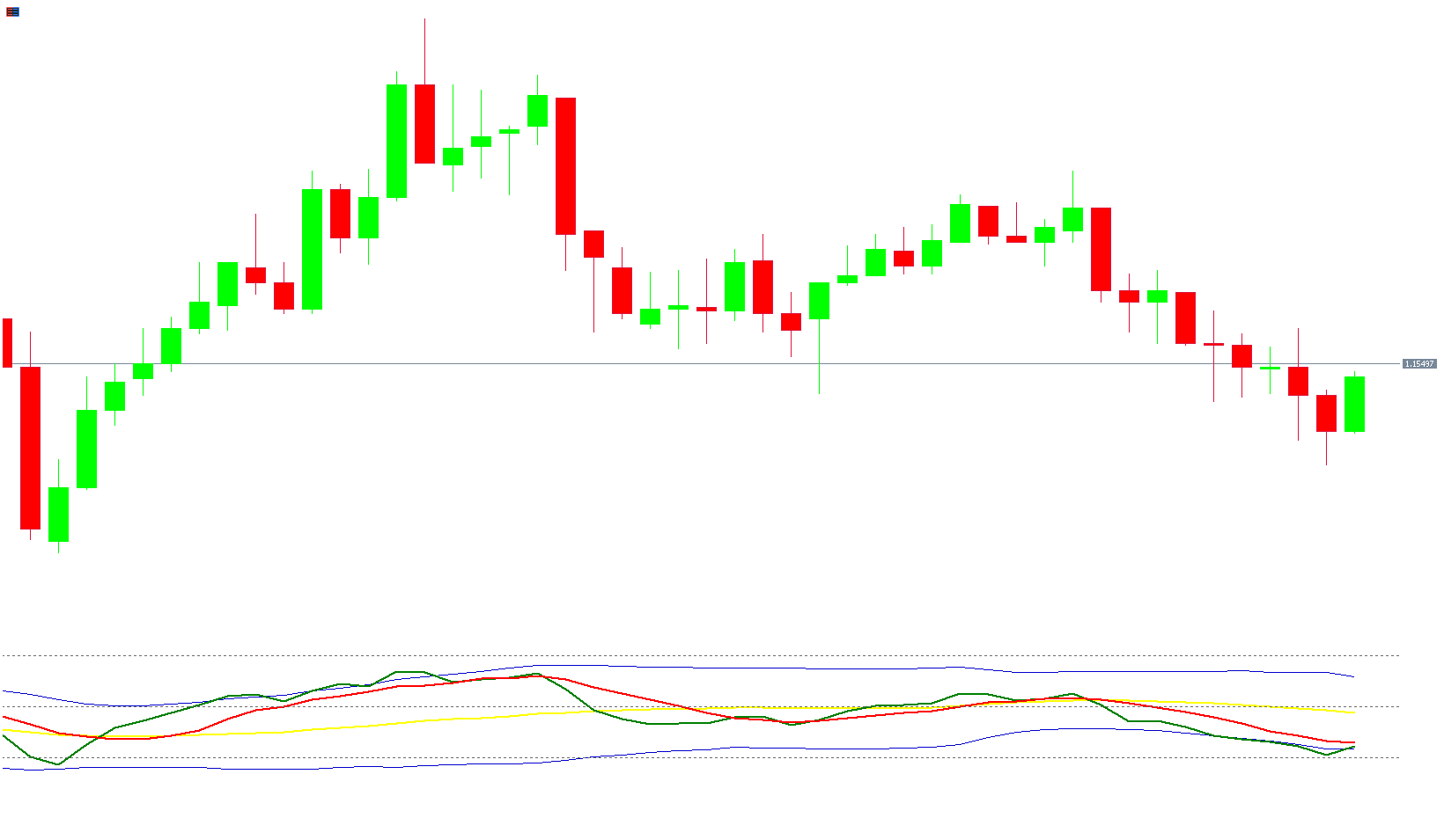 The opposite applies for sell trades: when the Green and Red lines touch the upper Blue Bollinger Band and turn downward, it signals potential bearish momentum.