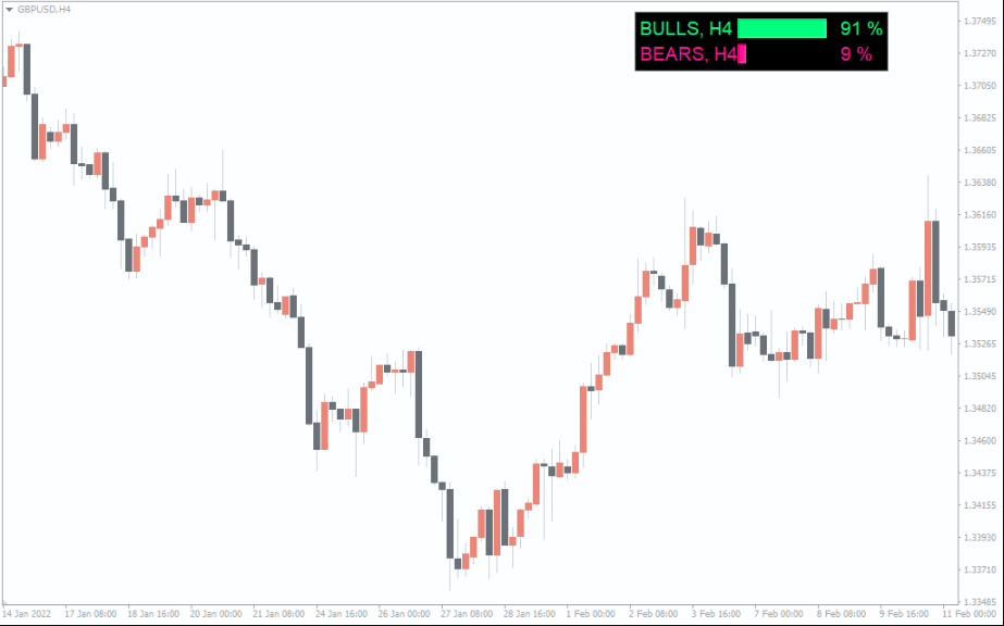 The Trading Volume Indicator for MT4 is a straightforward tool that helps traders understand overall market volume. It visually represents the bullish and bearish percentage of trades, providing clear insight into market sentiment.