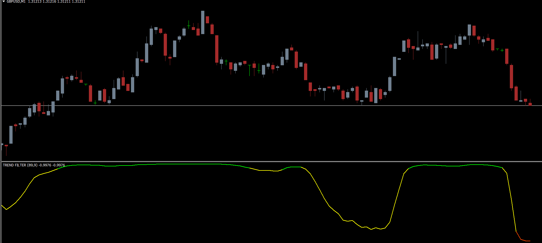 The Trend Filter Indicator uses a color-coded oscillator line displayed in a separate window below the chart. This visual design makes it extremely easy to interpret market sentiment at a glance.