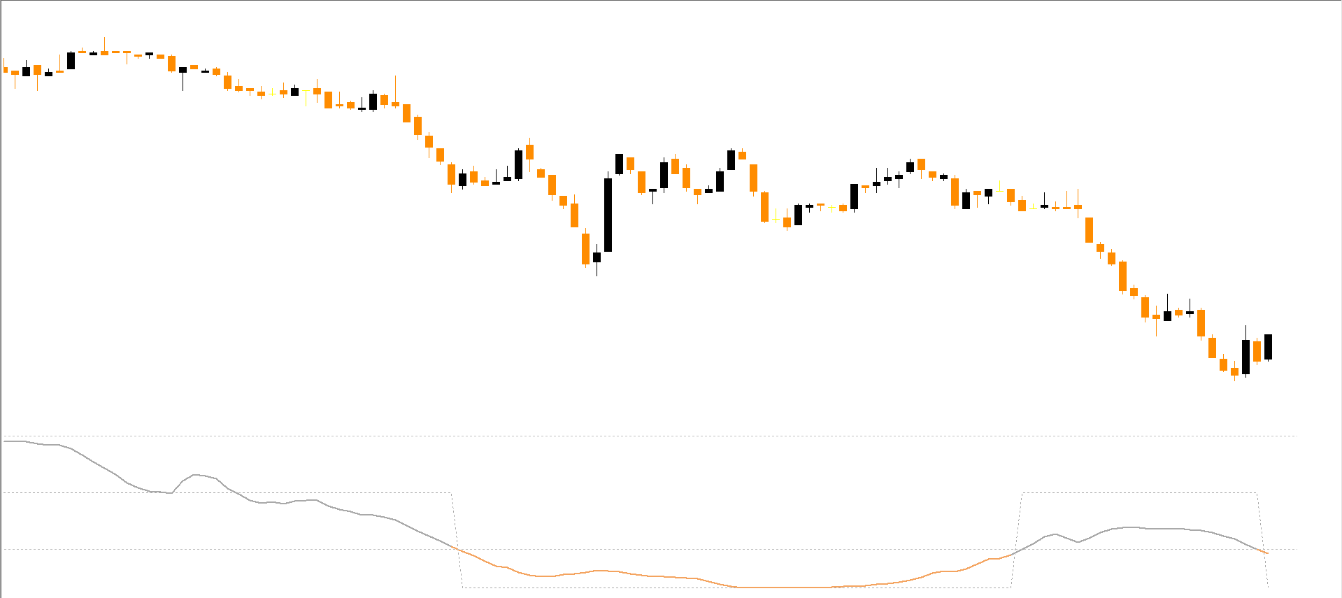 For sell confirmation, the line must drop below 80 and turn gray, signaling weakening bullish pressure and a possible downside move.
