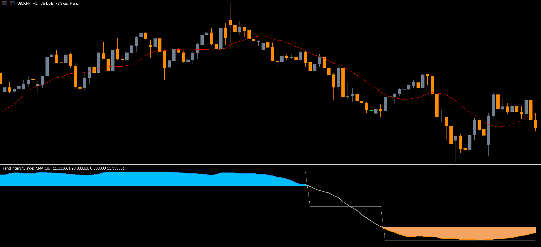 The Trend Intensity Index Indicator oscillates between 0 and 100 to reflect the strength and direction of the current trend. The signal line’s color and level indicate the market state: