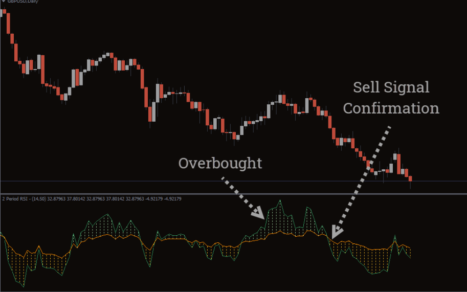 In the GBP/USD example, the fast RSI line first enters the overbought area, warning of a potential downtrend. Once it crosses below the slow RSI, the indicator confirms the sell signal. Price then follows with a strong bearish move, validating the crossover.