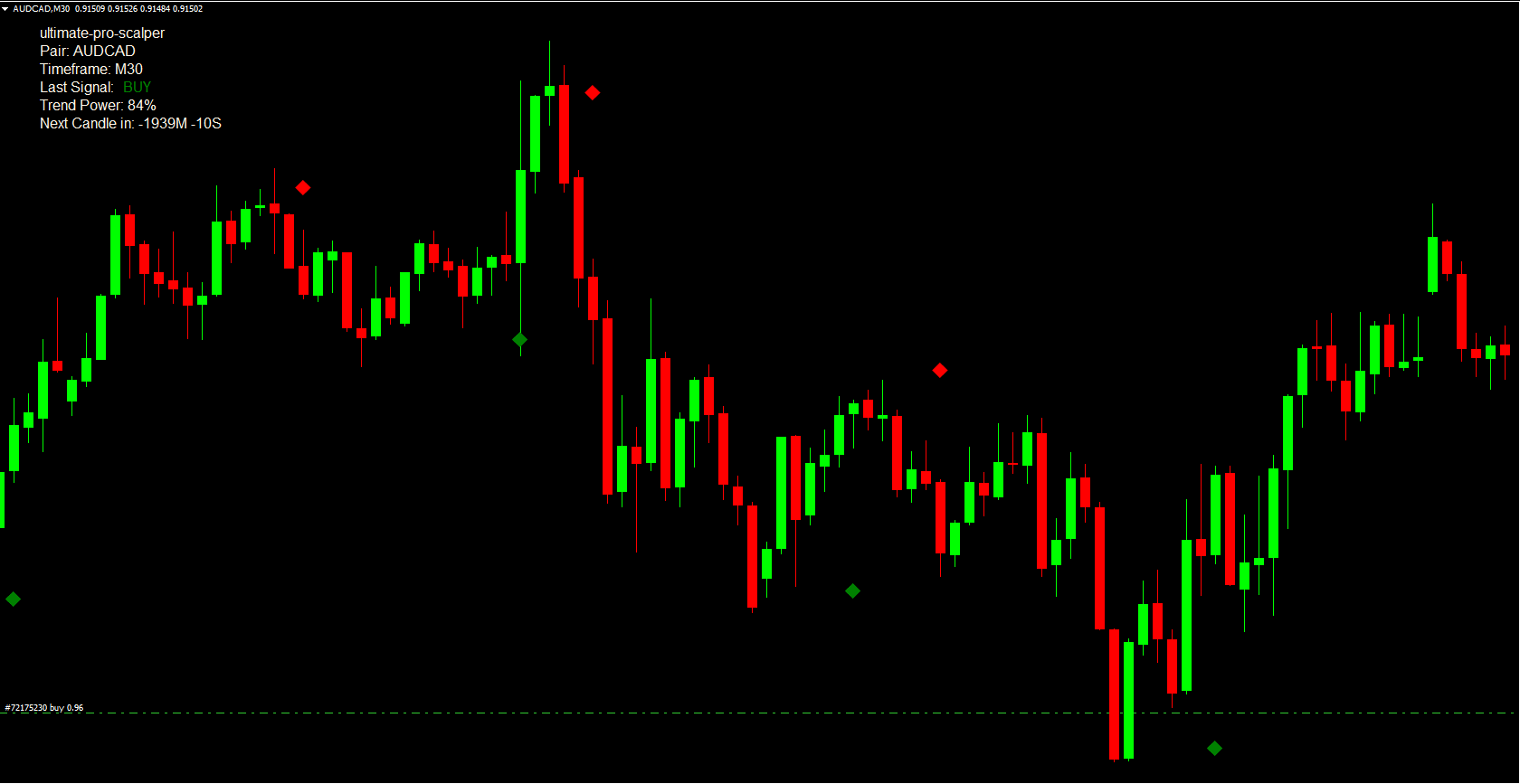 Buy Signal: When a green diamond appears, consider opening a buy position.