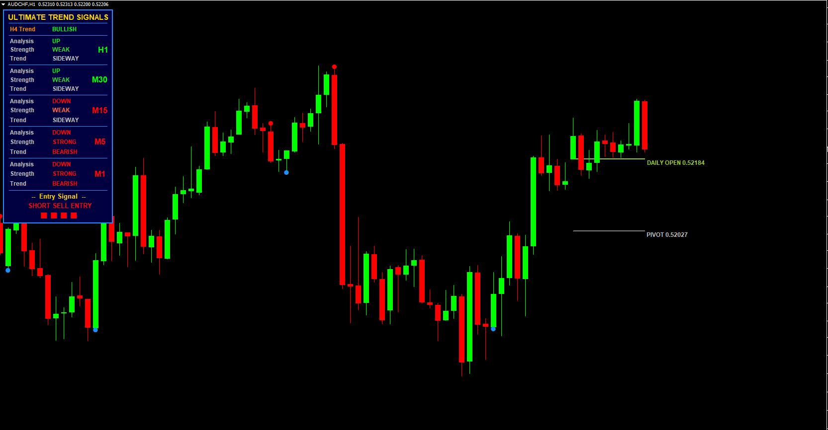 The Ultimate Trading Signals Indicator MT4 is a dynamic forex trading tool designed to simplify market analysis for traders of all levels. By combining the power of Moving Average (MA), MACD, ADX, and RSI, this indicator provides a comprehensive assessment of trend direction and trend strength across multiple timeframes—from H1 down to M1.