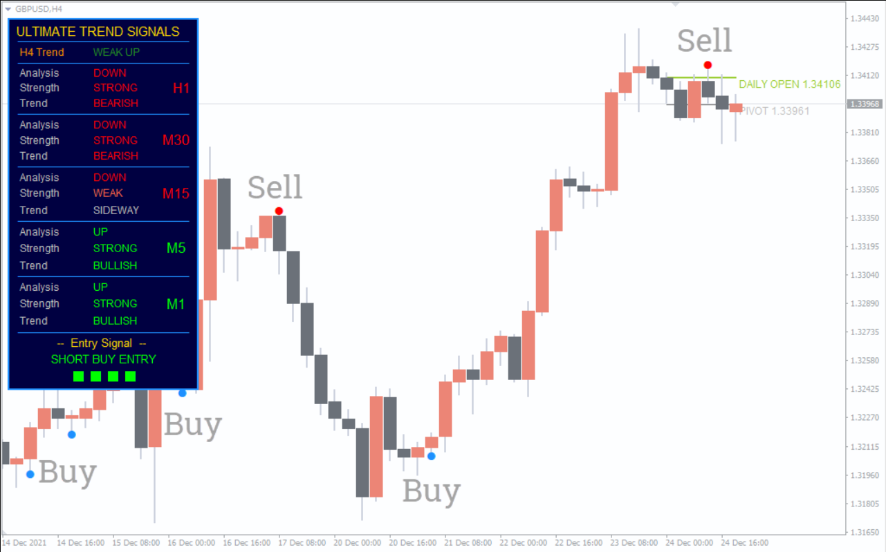 One of the key advantages of Ultimate Trend Signals V2 is its MTF (Multi-Timeframe) analysis. It shows: