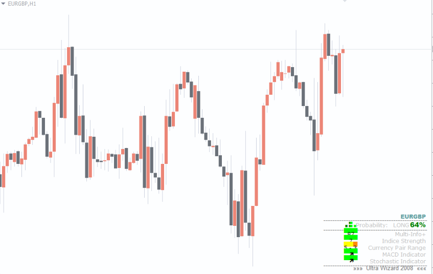 The Ultra Wizard Indicator for MT4 processes multiple data points from popular technical tools to generate a single, easy-to-read probability score. This score reflects the likelihood of bullish (green) or bearish (red) momentum in the market.