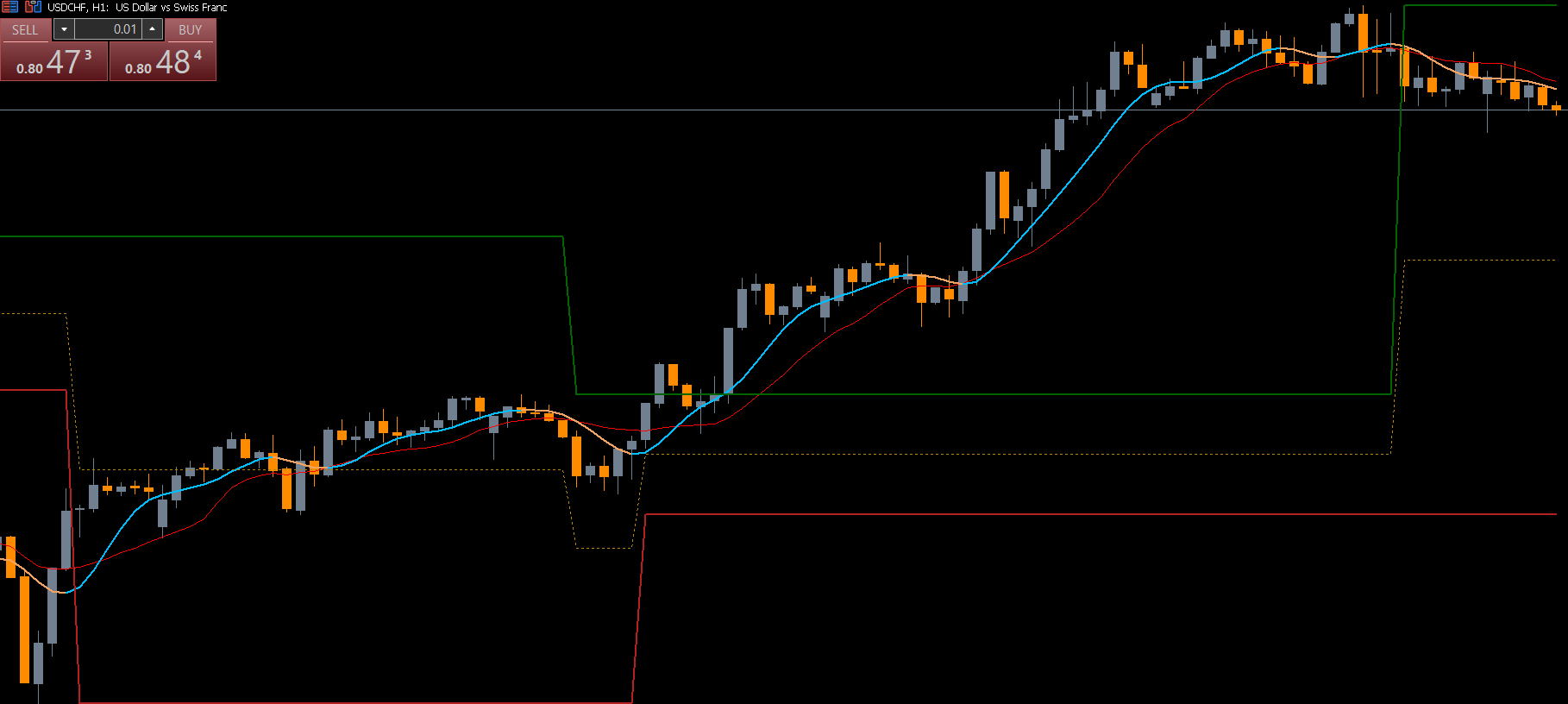 These adaptive levels help traders track trend movement as price travels through the market. The dotted lines often act as the first level of reaction, while the firebrick and dark green lines mark major dynamic turning points.