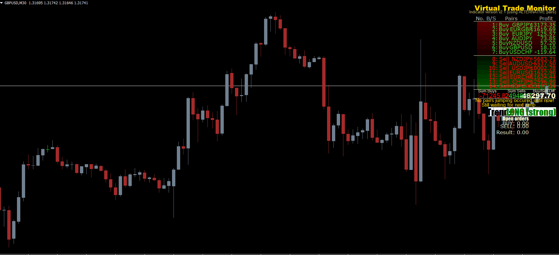 The Virtual Trade Monitor Indicator for MT4 is a simple yet effective tool for Forex traders, providing clear BUY/SELL signals for any chosen currency pair. This indicator plots a dialog box on the right side of your chart, showing all selected pairs' trading signals along with their current profit and trend strength.