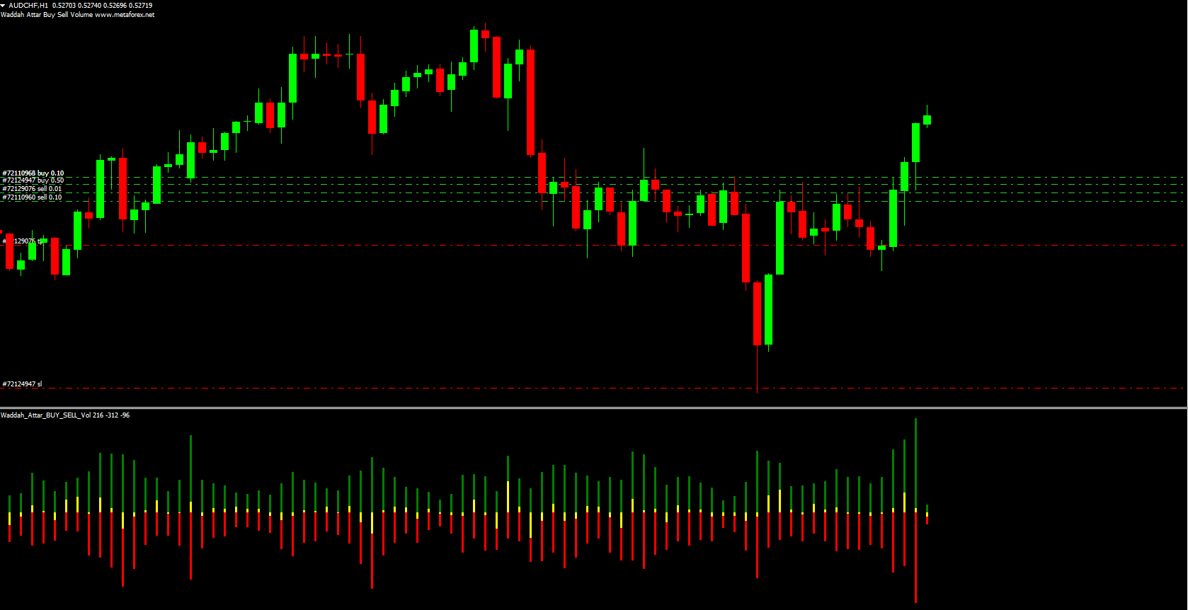 The Waddah Attar Buy Sell Vol Indicator is not a direct buy/sell signal generator. Instead, it provides valuable contextual insights into volume flow that traders can use alongside other technical indicators or price action setups.