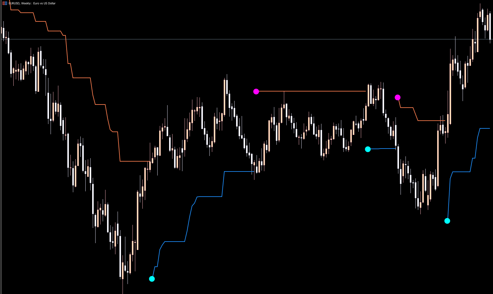 Trend Following: Follow the colored lines to ride trends while using circles for precise entries.