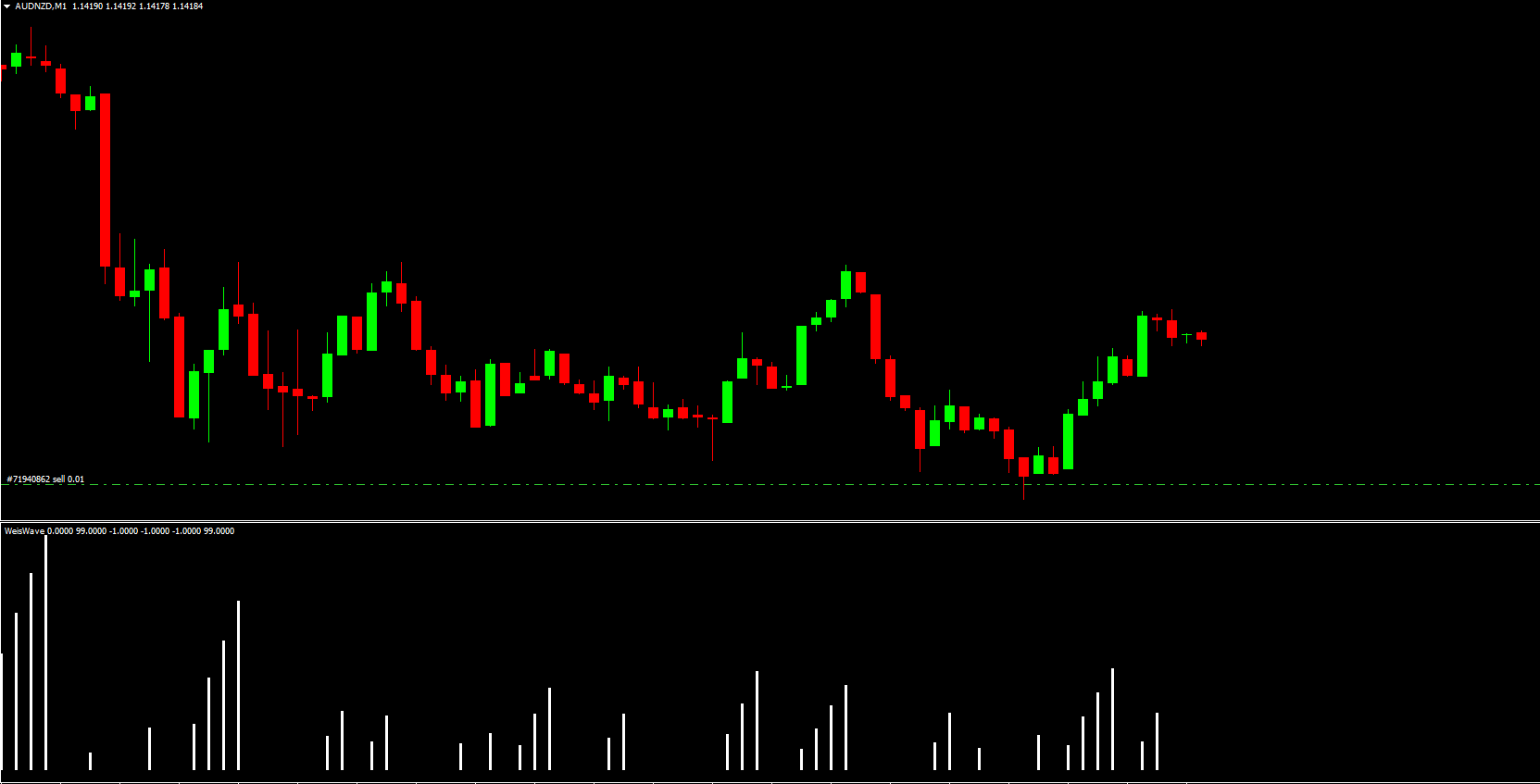 When added to your MT4 chart, the WeisWave Indicator displays a two-color histogram below the main price chart. Each wave in the price chart—bullish or bearish—is analyzed, and cumulative volume is calculated for that wave.