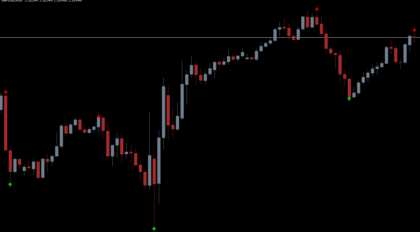 Red arrow down: Indicates a swing high (potential sell area).