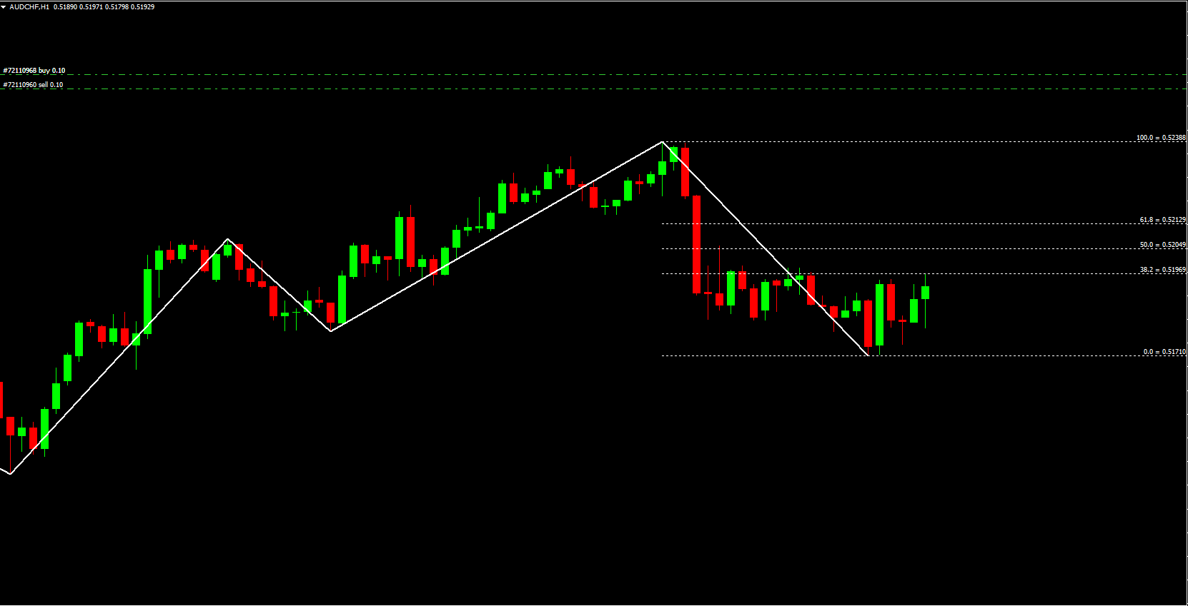 Draws Fibonacci retracement levels between the most recent Zigzag high and low.