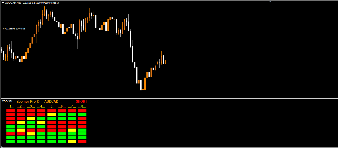 The Zoomer Pro Indicator continuously monitors eight different timeframes and evaluates each one based on momentum strength and trend direction. The results are displayed on the dashboard using a color-coded bar system: