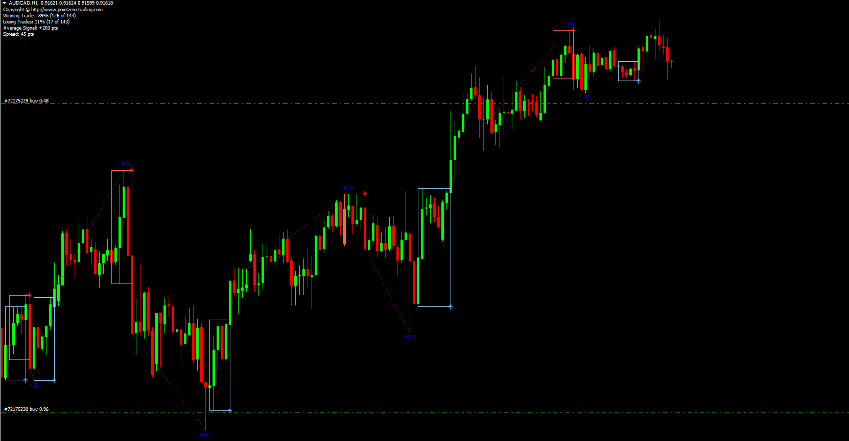 Additionally, the indicator displays trade statistics such as winning trades, losing trades, and average profit in white text, offering real-time performance feedback.