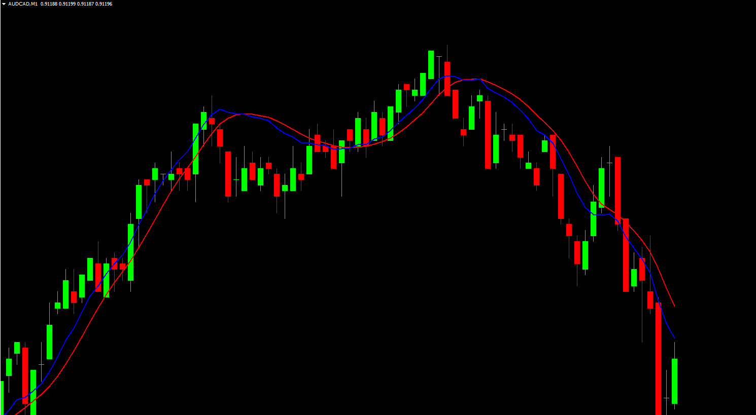 The indicator applies two moving averages directly to the price chart. The fast moving average is displayed in blue, while the slow moving average is shown in red. This color distinction allows traders to identify crossover signals instantly.