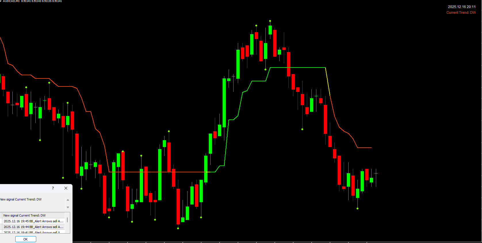 A dynamic line is plotted on the chart and changes color based on market direction: