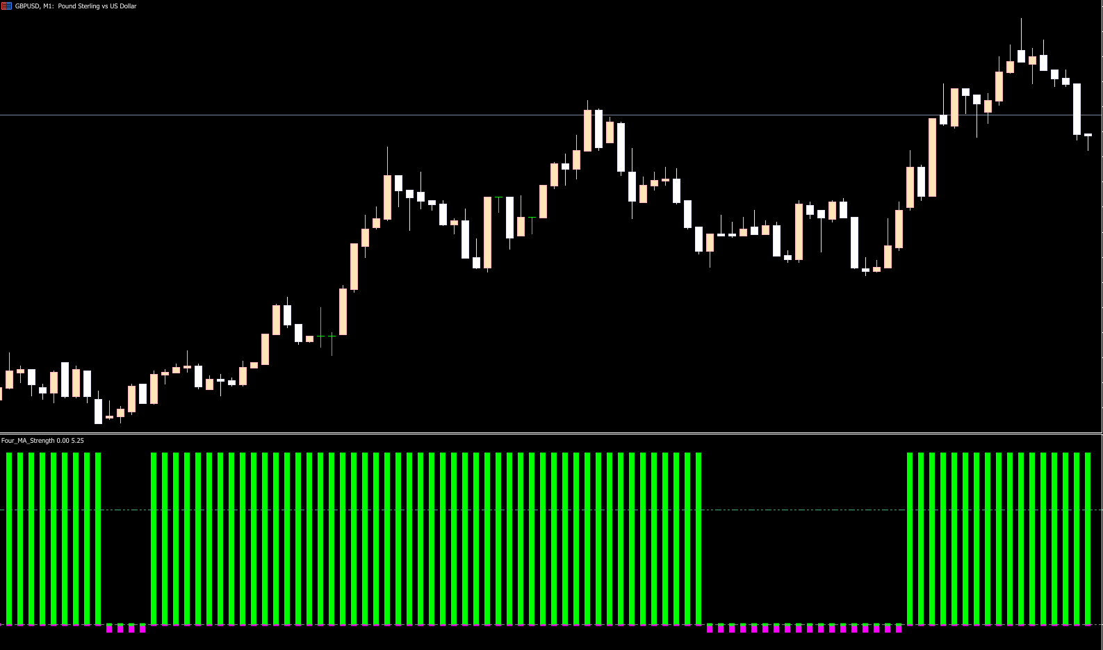 The 4-MA Strength Indicator for MT5 is a simple yet effective tool designed to measure trend strength using four moving averages. Unlike standard MA indicators that plot multiple lines on the chart, this indicator uses the combined behavior of four MAs to generate clear signals in the form of colored bars.