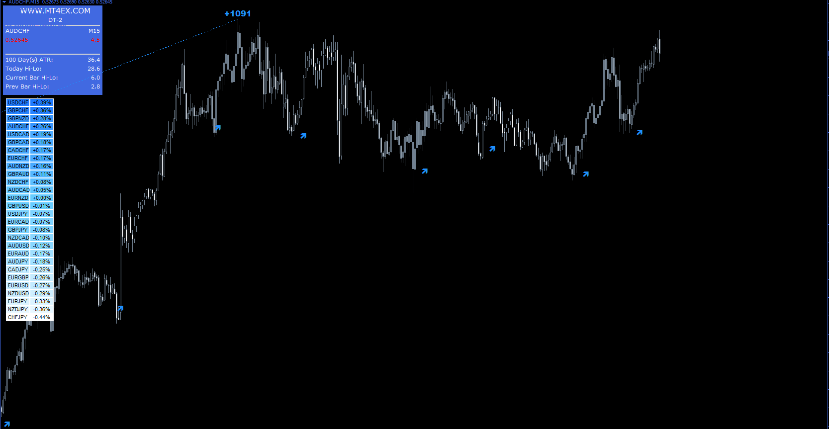 Each time a new signal appears, the indicator displays a colored arrow—blue for buy and white (or customizable orange) for sell. Accompanying each signal is a pip-count annotation, showing how many points have moved since the last alert (e.g., “+3200 pips”). This real-time feedback helps you measure trade quality instantly.