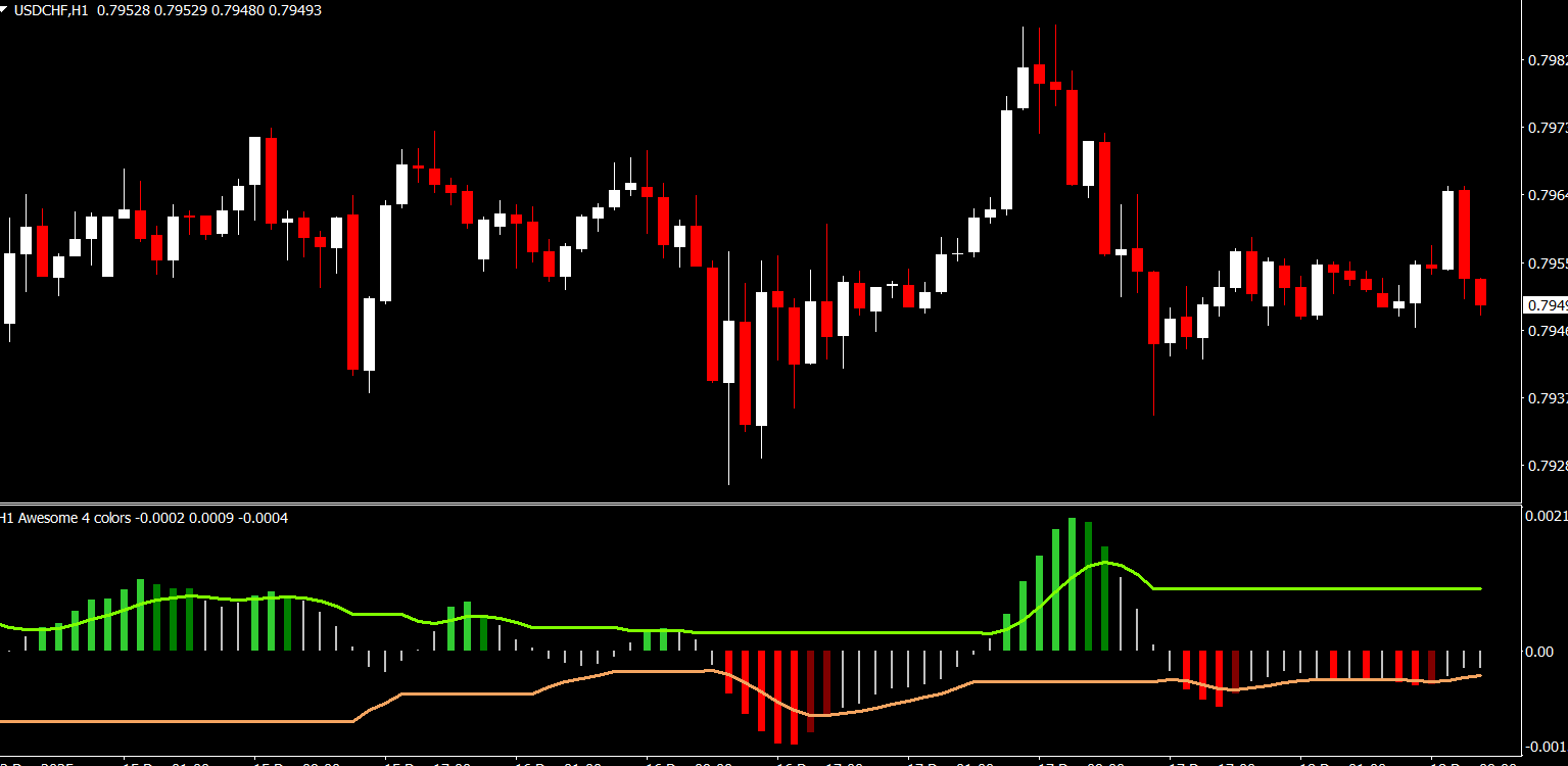Once added to an MT4 chart, the Awesome Accelerator Four Color Alert Indicator displays a histogram that changes color based on momentum strength and direction.