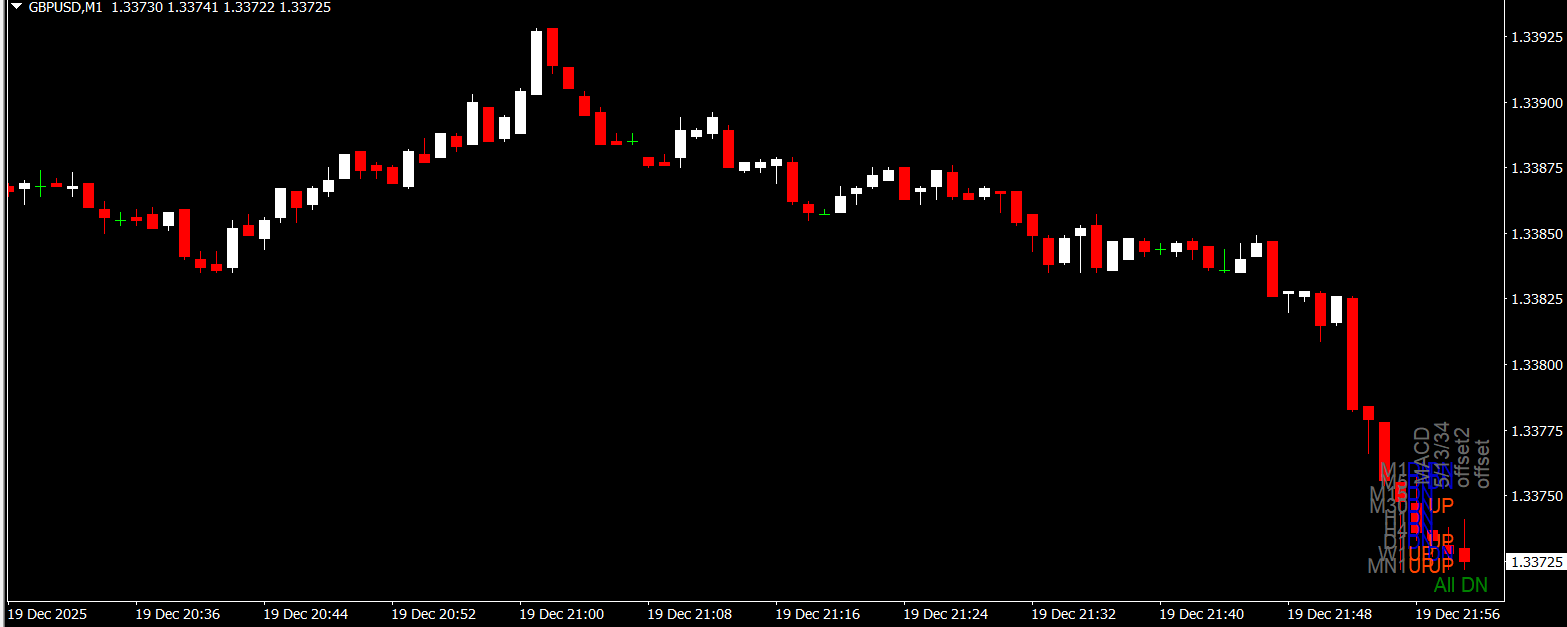 The indicator uses the MACD oscillator to assess market trends across different timeframes. It calculates the trend direction on each selected timeframe and displays it in a simple visual format. Traders can quickly see if short-term trends align with medium and long-term trends.