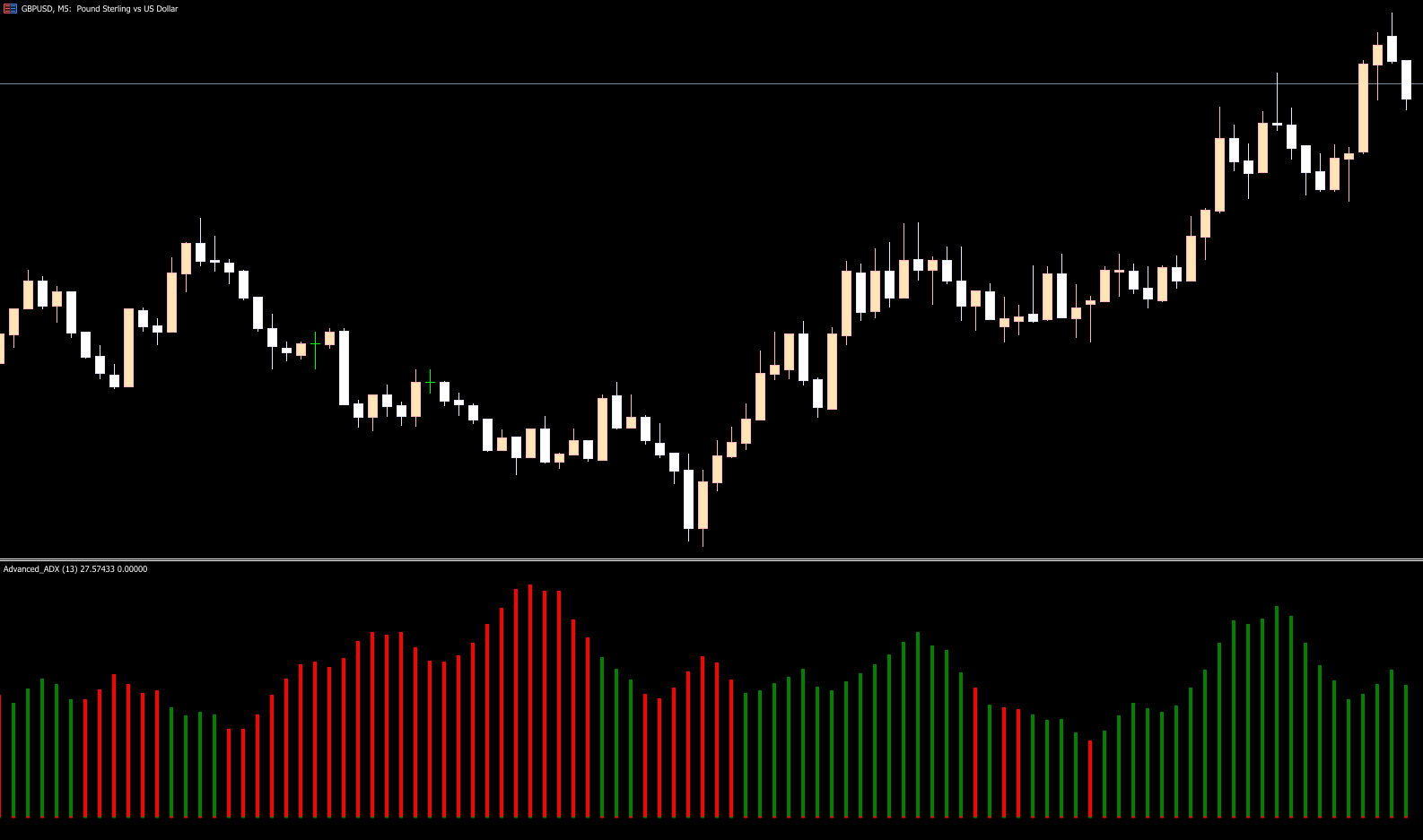 Unlike the standard ADX on MetaTrader, which shows D+ and D- lines, the Advanced ADX displays a colored histogram. This simplified visualization makes it easier for both beginners and experienced traders to identify trend direction and entry points.