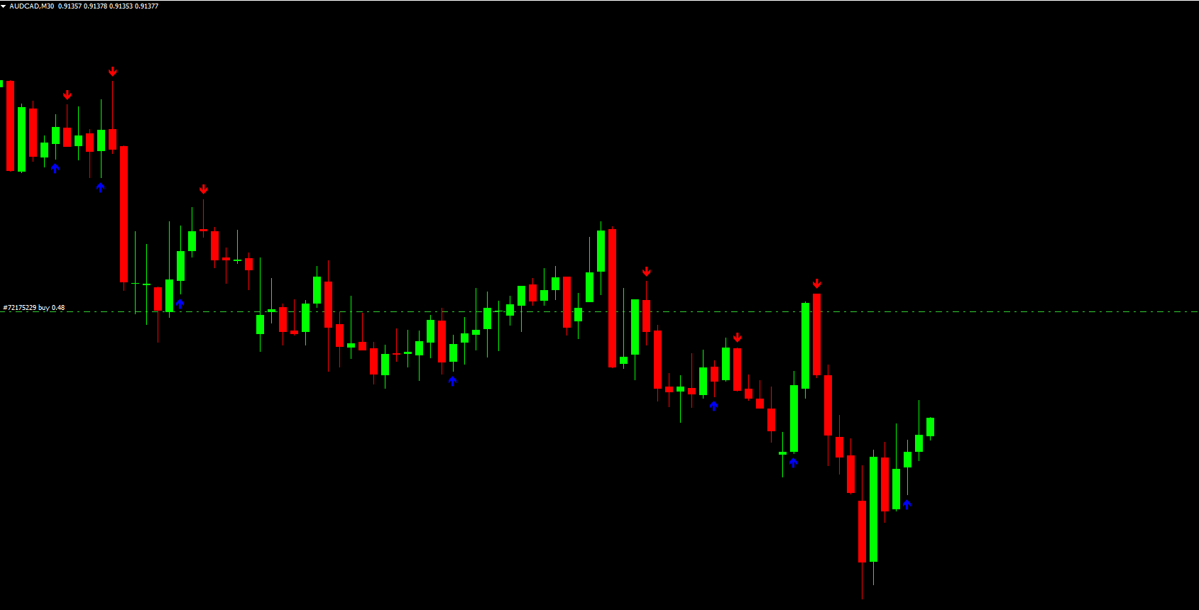 Buy/Sell Signals: Blue arrows indicate buying opportunities, and red arrows indicate selling opportunities.