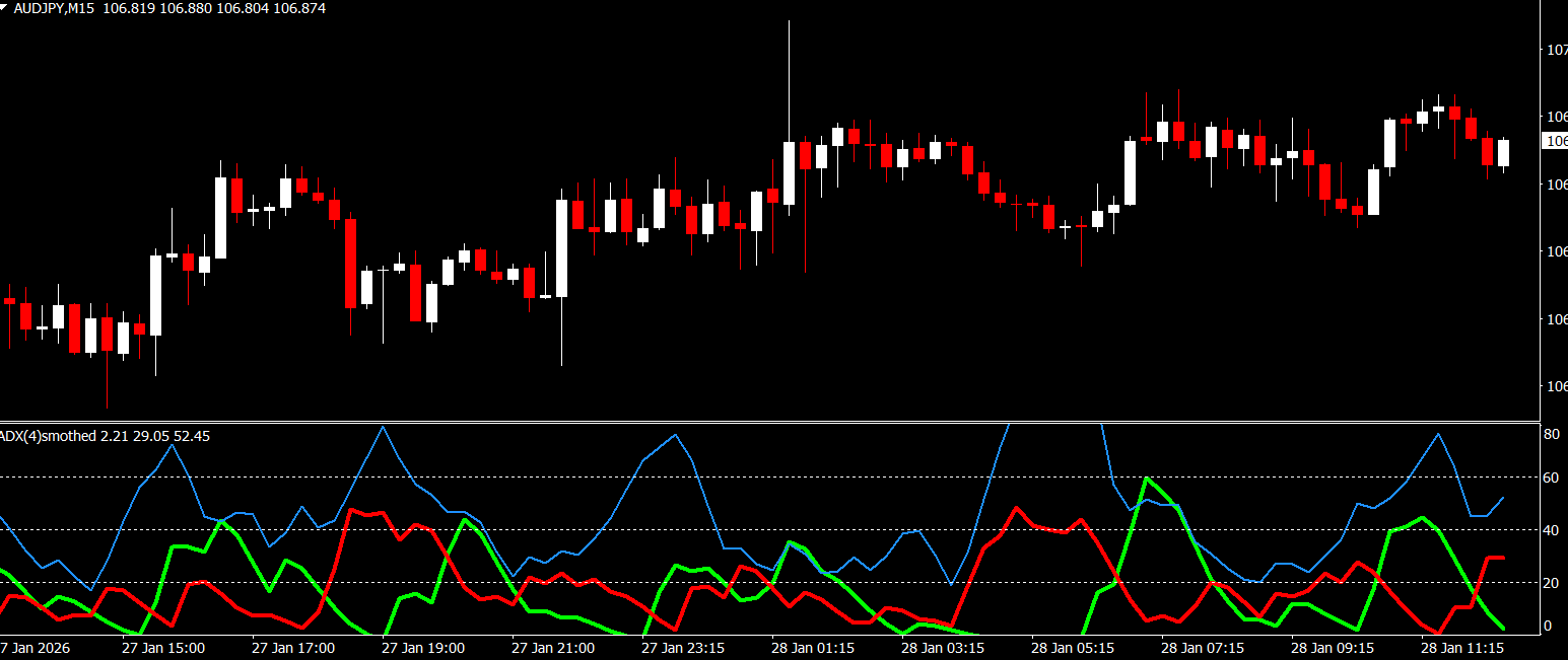 When the indicator drops below the lower level, it suggests weak trend strength or ranging market conditions. In such cases, traders may choose to avoid trend-following trades or prepare for possible reversals.