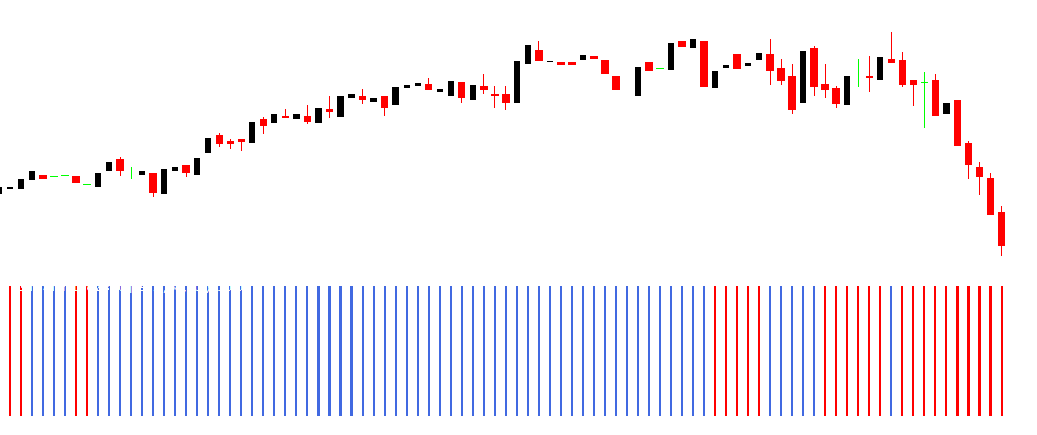 Once added to an MT4 chart, the indicator generates histogram bars that reflect the market’s current trend: