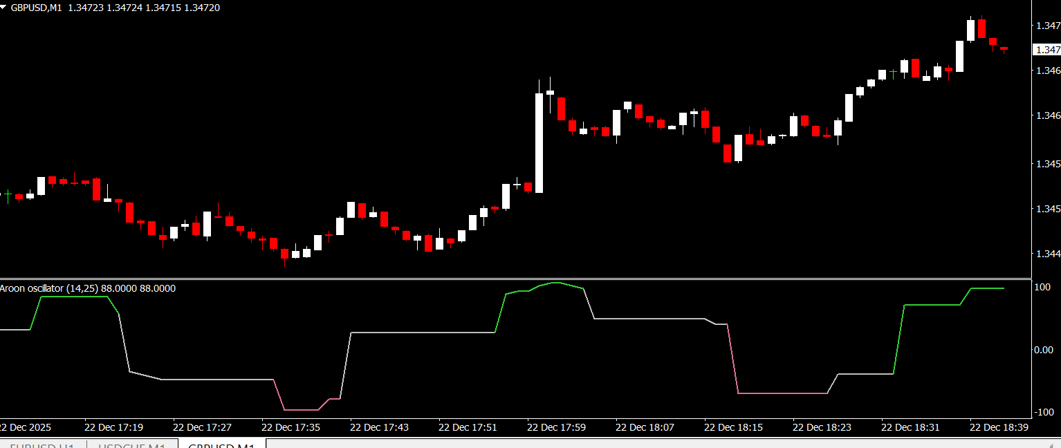 The indicator is calculated by subtracting the Aroon Down line from the Aroon Up line. When the Aroon Up line is above the Aroon Down line, the oscillator shows a positive value, indicating a strong uptrend. Conversely, when the Aroon Down line is above the Aroon Up line, the oscillator is negative, signaling a strong downtrend.