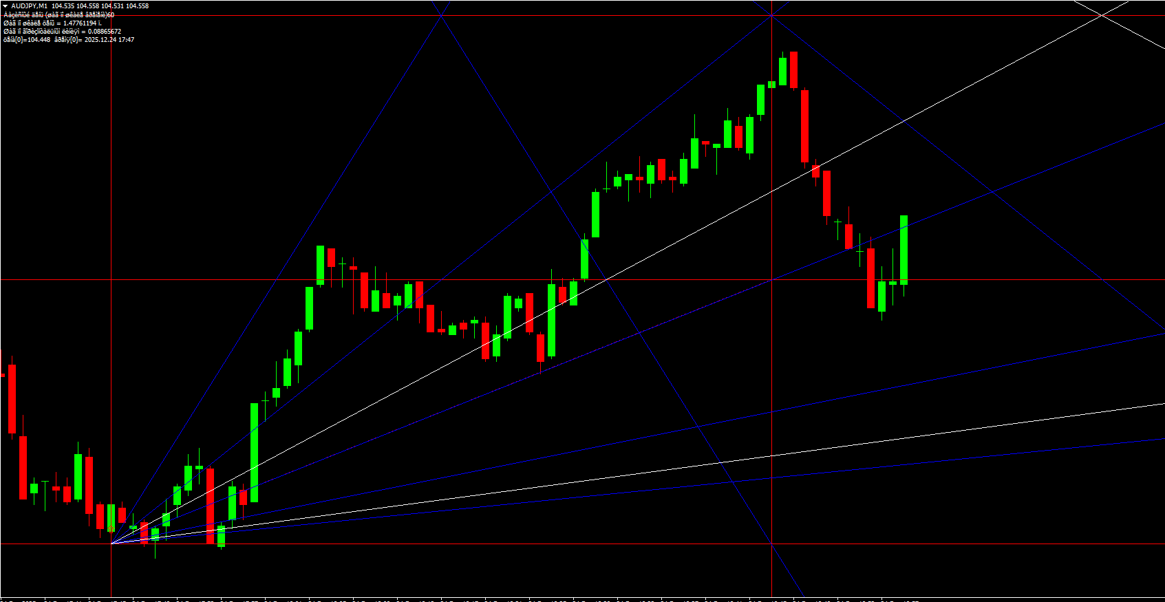 The Auto Gann Angle Indicator automatically plots multiple Gann angles directly onto the price chart. These angles are displayed as blue diagonal trend lines that act as dynamic price channels. They help traders understand whether price is moving above, below, or along a specific angle, which can indicate strength or weakness in the current trend.