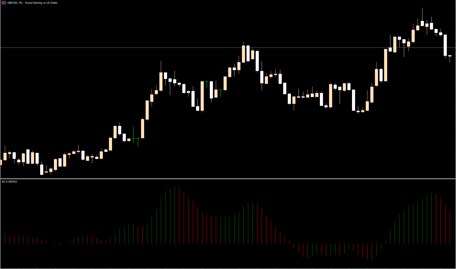 The indicator calculates the midpoints of each candlestick and applies two simple moving averages: a fast 5-period and a slow 34-period SMA. The difference between these two averages is plotted as a histogram: