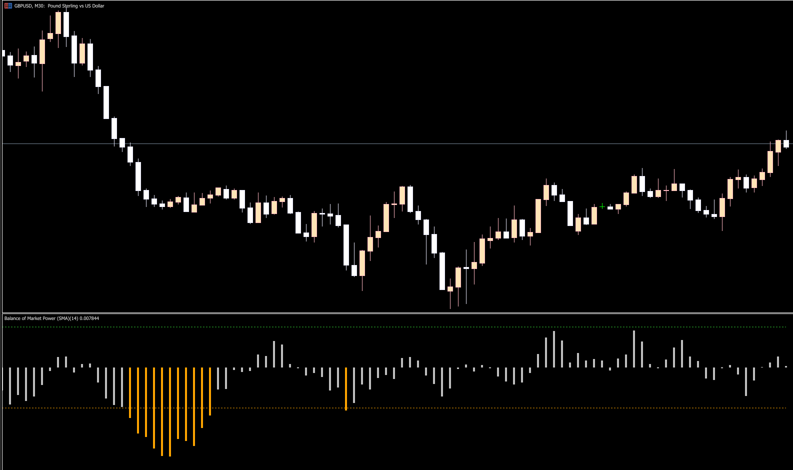 The BMPI MT5 plots a histogram representing the difference between the bid and ask prices. The color of the histogram changes depending on whether buyers or sellers dominate the market, giving traders a clear visual signal of market pressure: