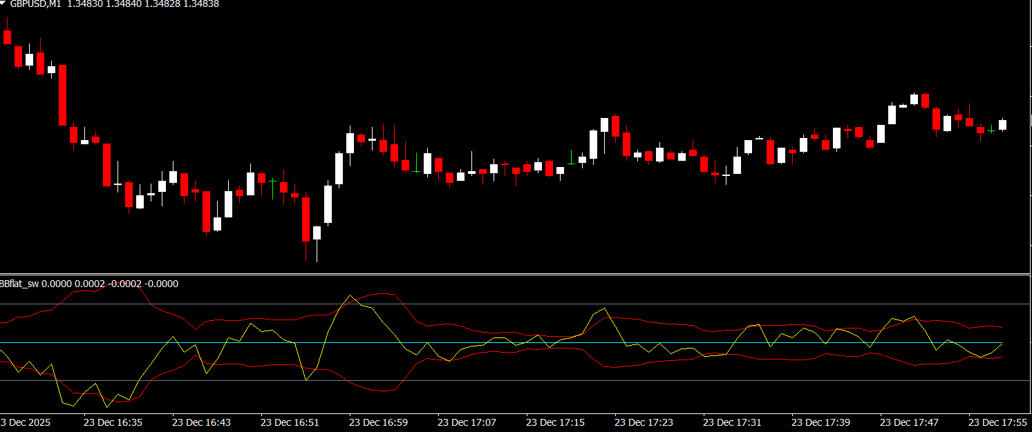 Flat or sideways markets often lead to losses for trend traders. The BB Flat SW Indicator helps identify these conditions by monitoring price behavior inside the Bollinger Bands. When price remains contained within the bands, momentum is weak, and the indicator signals a neutral state.