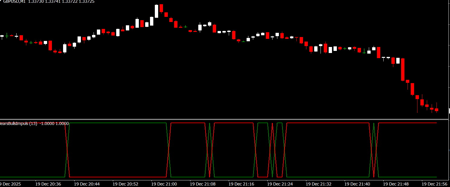 Traders choose the Bears and Bulls Impuls Indicator because it provides a clear and direct view of market momentum. Instead of guessing trend strength, traders can visually see whether buyers or sellers are gaining control.