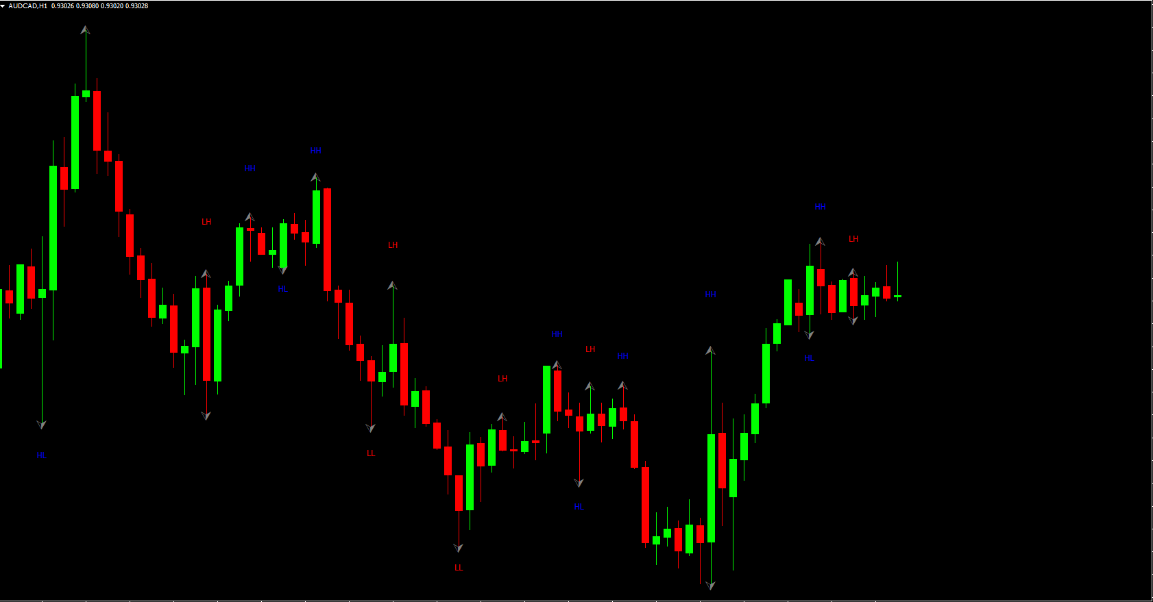 The Best Higher High Lower Low MT4 Indicator is a powerful pattern-recognition technical tool designed to identify the direction of the market trend with clarity and precision. This free Forex Indicator for the MetaTrader 4 (MT4) platform automatically highlights Higher Highs (HH), Higher Lows (HL), Lower Lows (LL), and Lower Highs (LH) directly on the price chart.