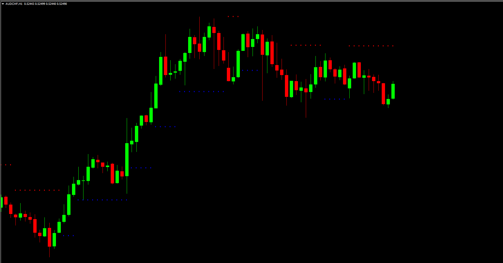 Begin by observing the overall trend direction on a higher time frame (H4 or Daily). If the indicator consistently plots red dots above price, it confirms a downtrend. Conversely, blue dots below price suggest an uptrend.