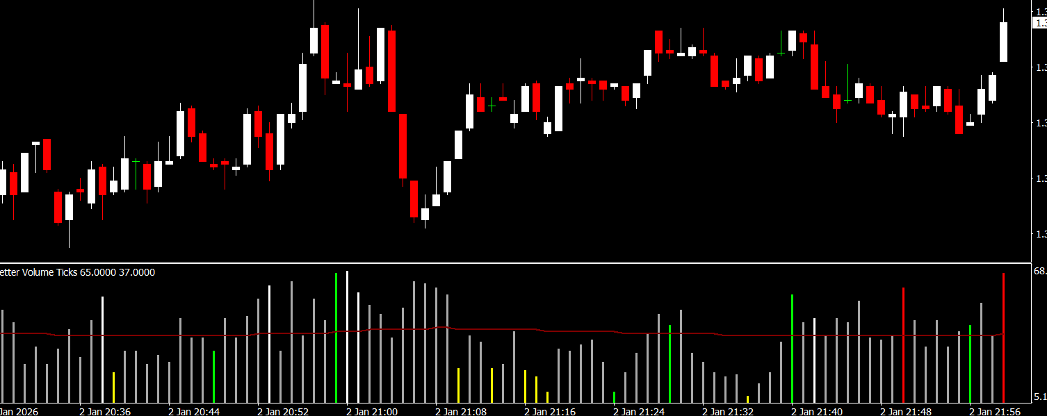 One of the key strengths of the Better Volume Ticks Indicator for MT4 is its color-coded histogram, which makes interpretation fast and intuitive: