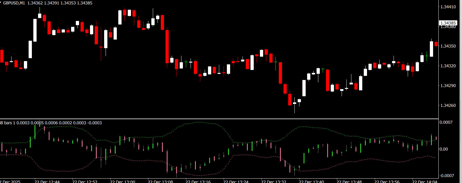 The Bollinger Band Bars Forex Indicator MT4 is based on the classic Bollinger Bands concept, which measures price volatility relative to a moving average. It plots upper and lower bands around Price Action and displays a histogram that reflects the strength of the current trend.