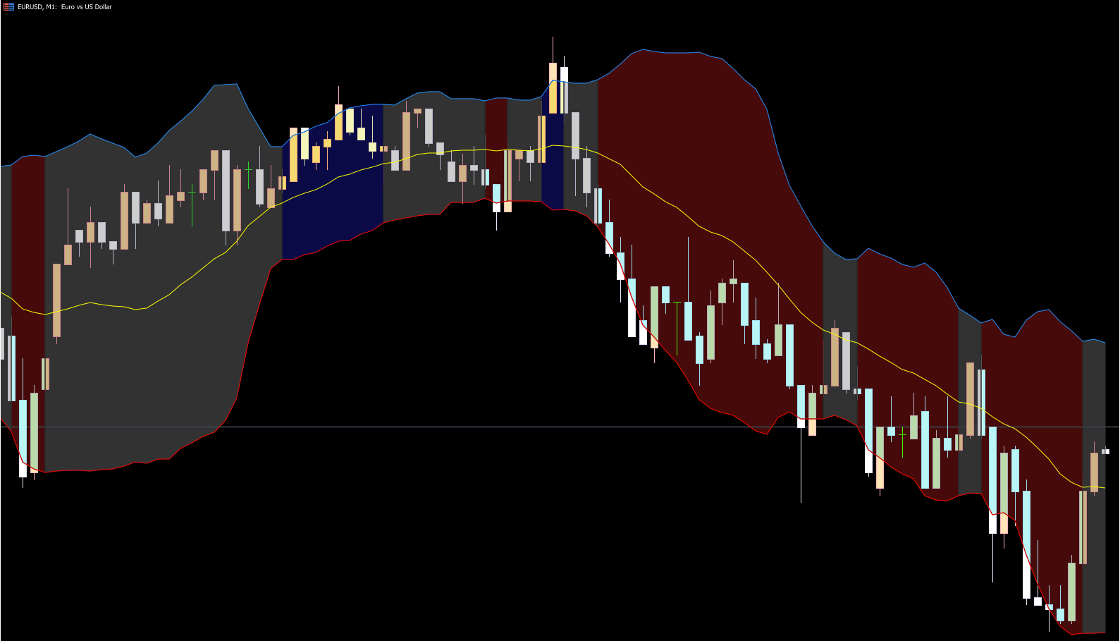 What makes this version unique is the color-changing feature. The bands automatically change color depending on whether price is trending upward or downward, providing instant visual feedback about market direction.