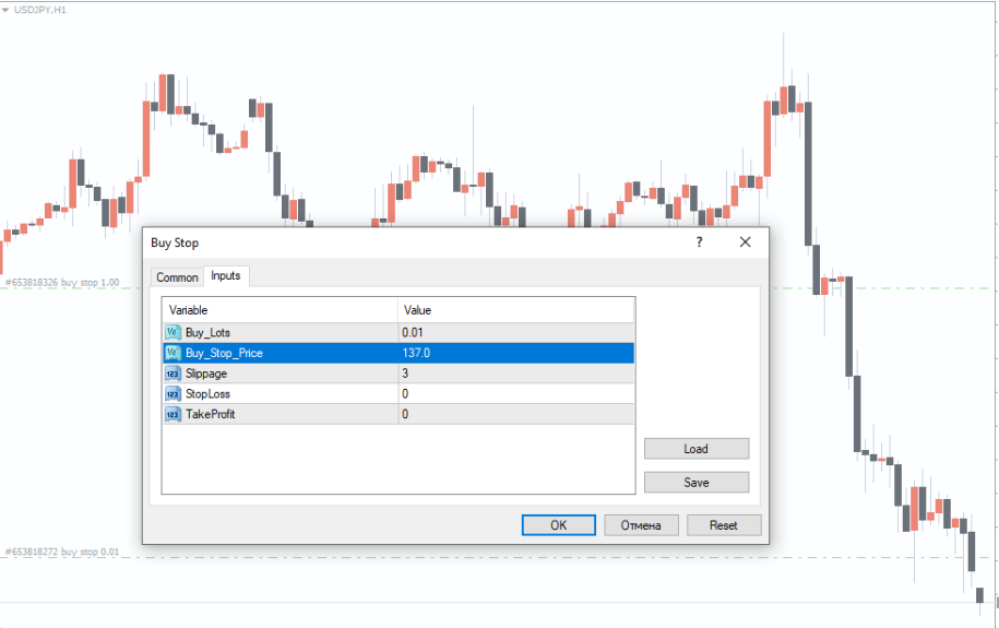 After configuring the inputs, the script activates the Buy Stop order. When the price reaches the set level, the order executes automatically as a market order.