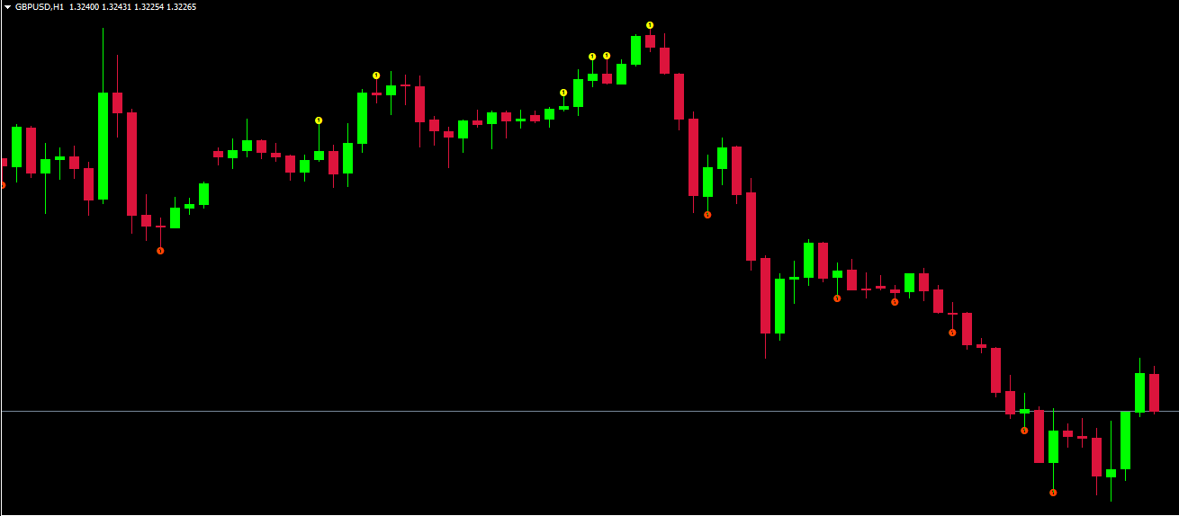 In a downtrend, wait for a yellow dot above the candle to enter a sell trade.