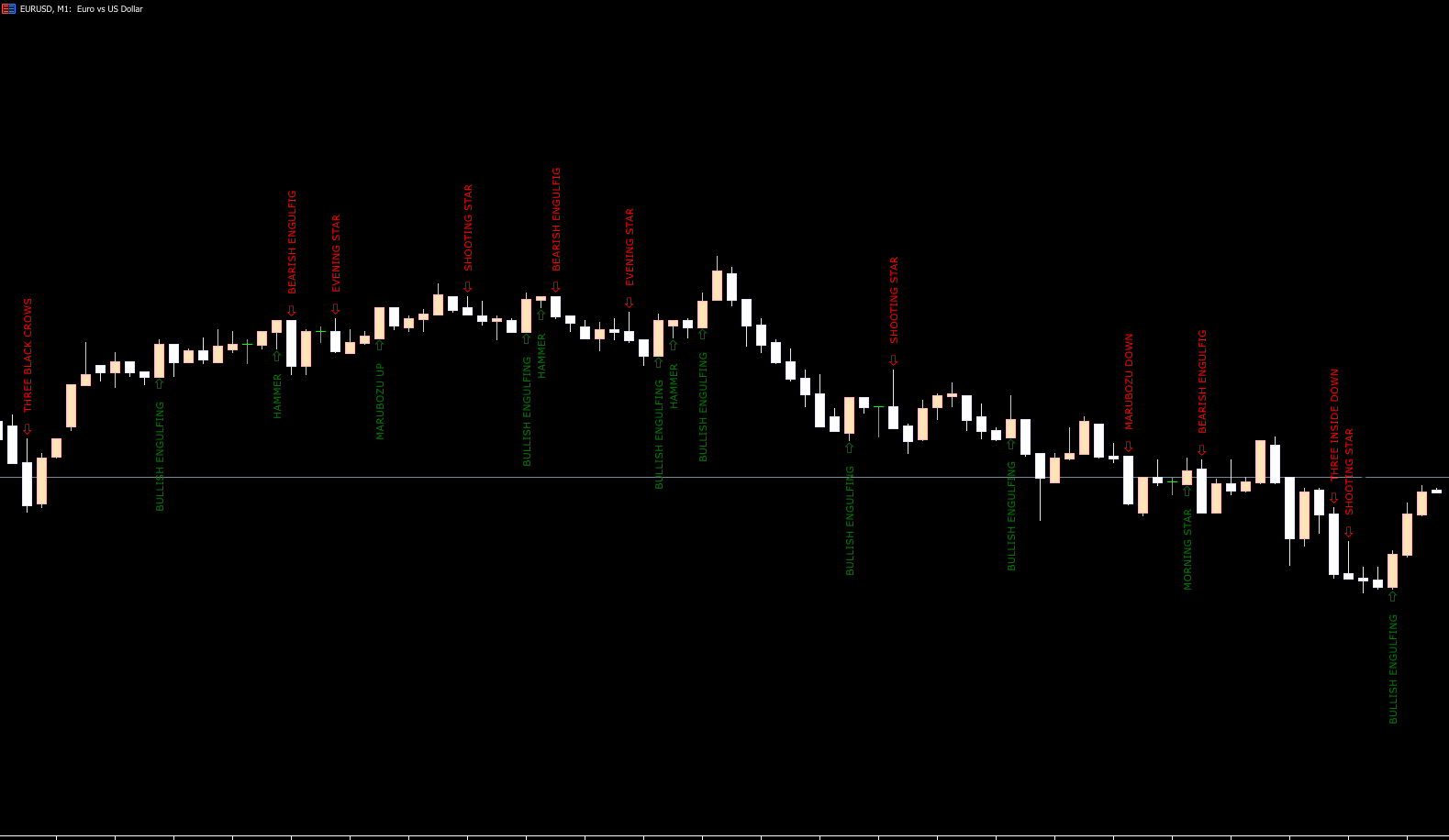 The indicator scans historical and real-time price data to recognize candlestick formations such as doji, engulfing, hammer, shooting star, and many more. Once a pattern is detected, it highlights the candlestick on the chart for easy identification.